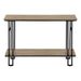 • Design & Finish: This 2-tier console table features a stylish wood-look finish on both the tabletop and bottom shelf, complemented by a contrasting metal base with open, U-shaped legs and decorative H-frame sides.