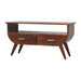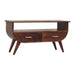 • Agra Media Unit - Introducing our eye-catching media unit, crafted from 100% solid mango wood with a chestnut finish. Its features include Nordic-style legs, shiny gold t-bar handles, and a generously sized open shelf, it's the ultimate blend of style and functionality. Elevate your living room with this essential and elegant piece.