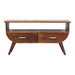 • Features: solid mango wood, chestnut finish, nordic-style legs, t-bar handles, open shelf,