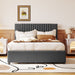 This beautiful upholstered platform bed features a classic headboard that adds a contemporary chic look to your bedroom and is filled with thick foam for extra comfort. The sturdy wood frame construction and wooden slat system provide additional stability and safety. Despite its size and solidity, this piece comes with hardware and instructions included, making assembly hassle-free. The upholstered platform bed includes two drawers and a large trundle that can easily be pulled in and out, offering maximum storage space and an extra sleeping area—perfect for organizing anything from clothes and bed linens to toys and games, as well as accommodating sleepovers.
