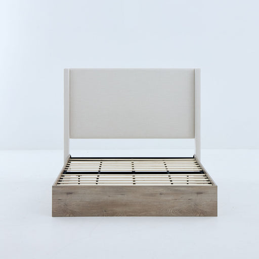 View full detailsShelton - Queen Upholstered Wingback Bed With 54" High Headboard - Ivory / Light Gray / Camel Oak