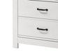 - The elegant and functional Cassini White 5-Drawer Chest offers generous storage space with its five spacious drawers, allowing you to neatly organize and store your belongings. Featuring sleek black handles, the drawers of this chest are not only easy to access but also add a touch of sophistication to its overall design. A unique visual element with its top drawers is the split design while maintaining their full size. The top surface makes an ideal spot for displaying decorative items, such as a small plant or a cherished photo frame. Each drawer provides ample space to store clothing, accessories, or other essentials. Elevate the organization and aesthetics of your home with this versatile and stunning piece of furniture.
