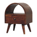 - Chestnut Dome Bedside - This bedside has been constructed from 100% solid mango wood and has a beautiful chestnut finish, it has been made with rounded top design with smooth edges, as well as a open slot and 1 drawer which feature a shiny brass knob, along with 4 Nordic style legs.