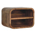 - Oak-ish Floating Open Curve Nightstand - Inspired by our curved range, this minimalistic wall-mounted unit has been constructed from 100% solid mango wood in an oak-ish finish and features 2 open sheves for storing any bits and pieces you wish to keep close by before bedtime. It's neat and clean design can easily be mounted on the wall without the fuss of any legs. Caution! Do not sit on the unit.