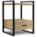 - Modern, industrial design includes black metal frame and black metal drawer handles