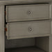 - Traditional design includes tapered legs, molded crown edged table top, panel framed drawer fronts and bronze round decorative pulls