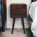 • Mini Light Walnut Curved Nightsand - The mini version of our famous IN308, this small but handy nightsand makes a perfect stand for nibbles, drinks, or a lamp. It will prove handy all over your home and is made from 100% solid mango wood in a fine light walnut finish. It has curved edges which will fit into any home/living space. It also comes with 2 drawers that come with shiny knobs and 4 Nordic style legs. This petite product is a part of Recession Collection.