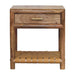 - Regency Woven Oak-ish Nightstand with Drawer - A stunning blend of artisanal craftsmanship and contemporary design, this bedside table is handcrafted from 100% Solid Mango Wood in a warm Oak-ish finish. Featuring a brass handle on the spacious drawer for a refined touch, it provides convenient storage while maintaining a sleek aesthetic. The leather handwoven braided bottom shelf adds texture and functionality, offering extra space for books, decor, or essentials. Supported by sturdy wooden legs, this piece exudes durability and elegance, making it a perfect addition to any bedroom or living space. Designed for those who appreciate sustainable, handcrafted furniture, it effortlessly combines style and practicality.