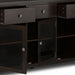 - Features three (3) drawers with metal glides, and three (3) tempered glass doors that open to large storage spaces with one (1) adjustable shelf each
