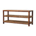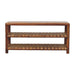 - Shoe Rack Regency Woven Chestnut 2 slot Artisan Furniture - Introducing the Braided Shoe Rack, where timeless design meets everyday functionality. Crafted from 100% solid mango wood in a rich Chestnut finish, this piece features three open shelves with two slots made with intricately braided leather, adding a unique texture and rustic elegance. Perfect for organizing shoes, accessories, or household essentials, its sturdy frame ensures lasting durability. The clean lines and warm tones make the Braided Shoe Rack a versatile and stylish storage solution that enhances the charm of any entryway, hallway, or living space.