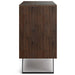 - Features two (2) doors with discreet hand pulls, two adjustable sheves and solid metal angled legs for reliable support