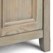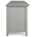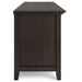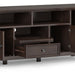 - Features a large centrally located open area with two drawers as well as two (2) framed doors with enclosed spaces; the two (2) large side storage cabinets open to one adjustable shelf each.