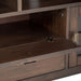 - Features a large centrally located open area with one (1) flip down drawer, one (1) pull out drawer as well as four (4) storage spaces with tempered glass doors.