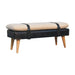 - Boucle Buffalo Hide Leather Bench - Derived from the French word for curled or ringed yarn or fabric. This handwoven upholstered furniture piece is made of 100% cotton and natural yarn, featuring buffalo hide leather to create a beautiful fusion of colours and materials. It has a belted strap design and also features solid wood legs which have and finish providing strength and durability.