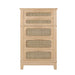 - Unique Materials: Features light pine wood veneer and caning inset on the drawers, offering a bohemian feel with mid-century flair.