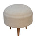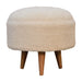 - Cream Boucle Rounded Footstool - Derived from the French word for 'curled' or 'ringed' yarn or fabric. This handwoven upholstered furniture piece is made of 100% cotton and natural yarn. This round footstool combines nordic style legs which are constructed from 100% solid mango wood and a soft cushioned top. The perfect accent piece to add to any room in the house.