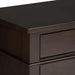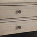 - Transitional design includes defined double molded top, tapered table legs, flat panel drawer fronts and antique bronze rounded decorative handles