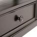 • Transitional style includes elegantly tapered legs, molded crown edged table top, panel framed drawer fronts, metal drawer glides and Antique Pewter round decorative knobs