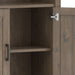 - Transitional design includes shaker style doors featuring X detail in panel, bronze pulls and square tapered legs