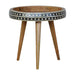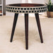 - Small Patterned Nordic Style End Table - This solid wood end table has made from 100% mango wood in a fine finish. The no-fuss finish reveals the beautiful grain of the mango wood which this piece of furniture is made of. This tripod table stands on Nordic style legs and features a and white bone inlay pattern on the edges. The bone is sourced responsibly from deceased animals such as camels, goats, and buffaloes.