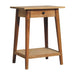 - Artisan Furniture Solid Wood Woven Solid Wood End Table - This end table is the perfect addition to any room. Suitable for narrow hallways as an ideal place to store small items like keys and address books. It is constructed from 100% solid mango wood and has a lovely oak-ish finish with a jute bottom shelf. Other features include tapered legs and a round shiny knob for the drawer.